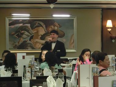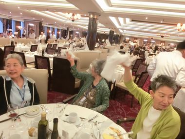 夕食時間後半になり、チーフスタッフの歌が始まり、 同時にスタッフと乗客のダンスが始まった ![]() |